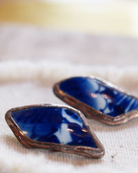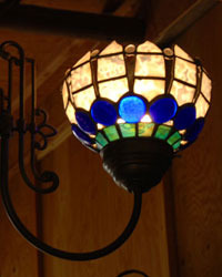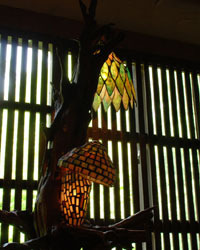 パネルやランプはもちろん、アクセサリーからオブジェに至るまですべて手づくりです。骨董が大好きで、古伊万里の器や古布、アンティークのベースや鉄などとコラボした作品や、古い水屋や書棚をガラスを用いてレトロな雰囲気にリメイクした作品も制作しています。